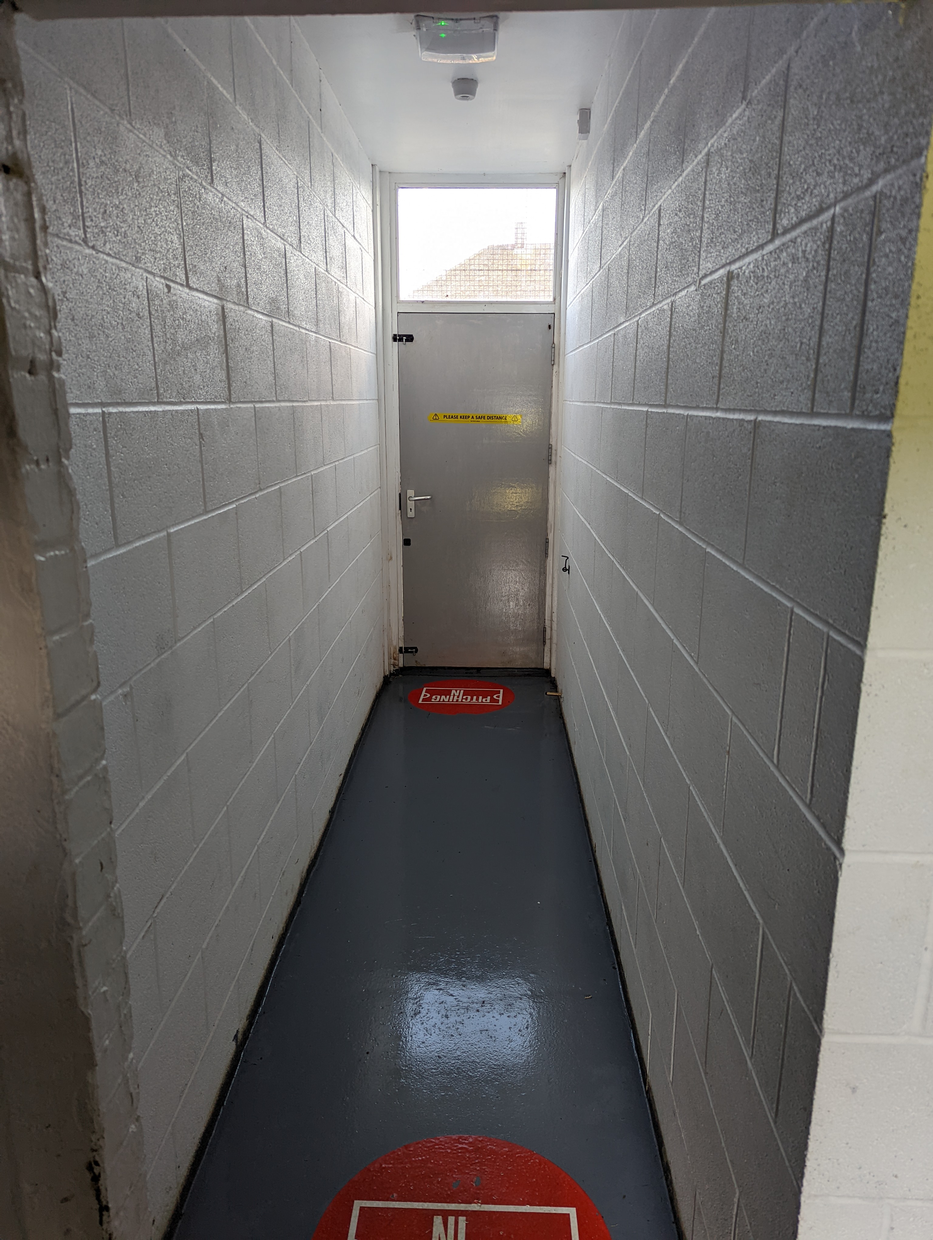 Corridor that was the old Refs Room - Original Stand Entry door from the 20's was put back, and both changing rooms expanded by .5m each to comply with modern regulations/grading. (Refs now in portacabins at the back of the stand).